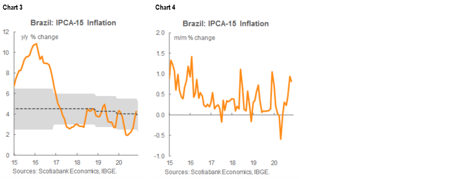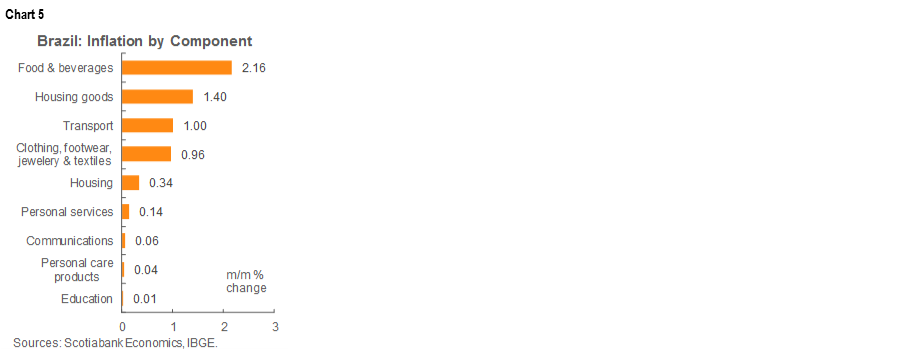 As has been the case in the past few prints, non-durable consumer-goods prices generated the bulk of inflationary pressures (chart 5): food & beverage prices were up 2.16% m/m, appliance prices rose 1.4% m/m, and clothing prices gained 0.96% m/m. Amongst services, transportation prices, up 1.00% m/m, saw substantial gains. The government’s stimulus to consumer spending was likely one of the main factors that boosted prices. One consolation for the BCB is that we have not, at least yet, seen material inflationary contagion into prices for services and durable goods and, overall, sequential monthly inflation didn’t accelerate further.