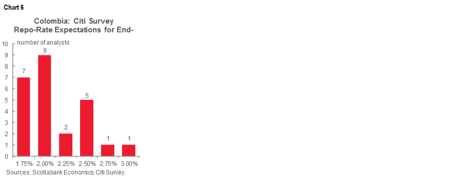 - Market consensus points to rate stability. A full 100% of analysts surveyed expect the monetary-policy rate to remain at 1.75% for the rest of 2020. In 2021, consensus expects one 25 bps hike: although analysts’ projections are dispersed between stability and 125 bps hikes, the mode is at 2.00% (chart 6).