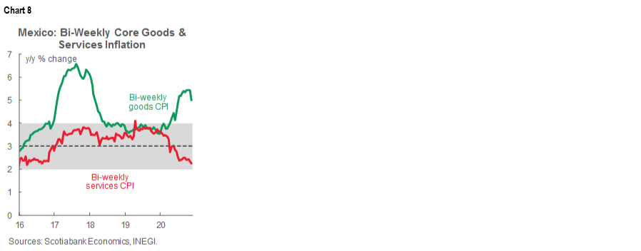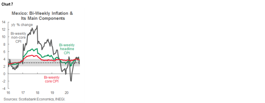 Inflation for the first half of November came back into Banxico’s target range, according to data released on Tuesday, November 24. Headline annual inflation came down from 4.09% y/y in late-October to 3.43% y/y in early-November (versus 3.61% y/y consensus), still higher than the 3.10% y/y we saw at this time last year (chart 7). On a sequential basis, inflation slowed from 0.16% 2w/2w in late-October to 0.04% 2w/2w in early-November, below the 0.23% 2w/2w consensus.