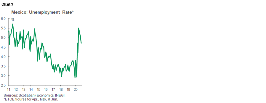 INEGI also released on Tuesday, November 24, the fourth edition of its new Survey on Jobs and Employment (ENOE), which is mainly based on face-to-face interviews (86% of respondents) with some telephone conversations (14% of respondents). The unemployment rate came down from 5.1% in September to 4.7% in October, “in line with the evolution of the pandemic in the country” (chart 9). Still, INEGI highlighted that the average unemployment rate for January to October was 4.5%, the highest rate for the first 10 months in six years. Some further notable points included:
