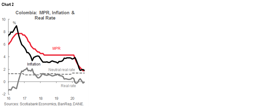 No central bank monetary-policy decisions are scheduled for this week, but today is set to see the publication of the minutes of the Friday, November 27, decision by the Board of Colombia’s BanRep to hold its headline policy rate at 1.75%. After the Board’s unusually short statement following the meeting, the minutes may not provide much more insight on members’ thinking as they remain in data-dependent, “wait-and-see” mode with rates expected to stay on hold into H2-2021 in our forecasts (chart 1 and the November 28 Latam Weekly).