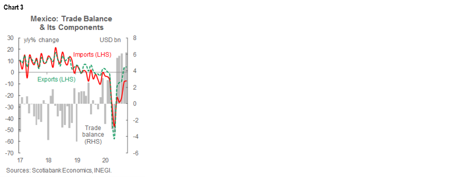 According to the figures published by INEGI on Friday, November 27, the October trade balance surprised (as it has done most months since the resumption of activities) with a record surplus of USD 6.2 bn versus the USD 3.6 bn expected. This was well above the deficit of USD -688 mn we saw in October 2019 (chart 3) and put the trade balance for the first 10 months of 2020 at a strong USD 25.1 bn.