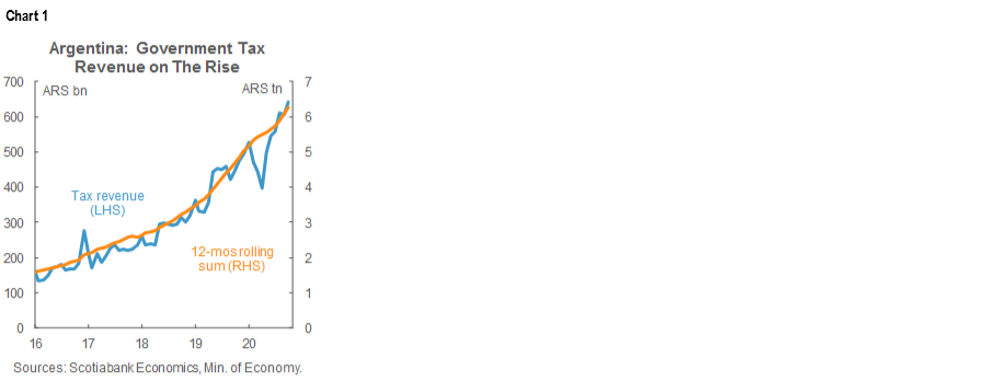 Overall, the print will be encouraging for the Ministry of Economy, which has promised to forego budget transfers from the BCRA (central bank) through the end of 2020. The tax revenue numbers also imply that growth is set to be a bit stronger at the start of Q4 than recent real-economy indicators have suggested.