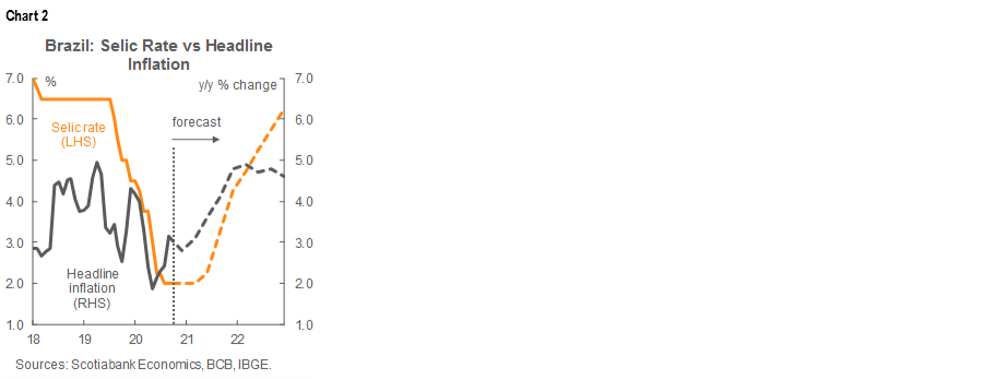 The BCB released at 06:00 on Tuesday, November 3, the minutes from its latest Copom meeting on October 28 at which it unanimously voted to hold the Selic rate at 2.00% (chart 2), a record low; the detailed account of the discussion largely reinforced the major messages conveyed in the Copom’s statement.