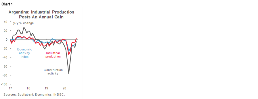September industrial production data, released by INDEC on Thursday, November 5, showed their first annual gains since the pandemic began, while construction activity also neared levels from a year ago. The month’s industrial activity was up 3.4% y/y, a significant improvement from August’s -7.0% y/y (revised up from -7.1% y/y) and the strongest annual gain since the first half of 2018 (chart 1). Construction activity also significantly narrowed its gap compared with pre-pandemic levels as it registered an annual contraction of only -3.9% y/y, much better than the -17.7% y/y registered in August. The two sectors account for over a fifth of Argentina’s GDP and their September numbers represent an unexpectedly solid signal amidst FX-market turmoil and local surges in the pandemic.