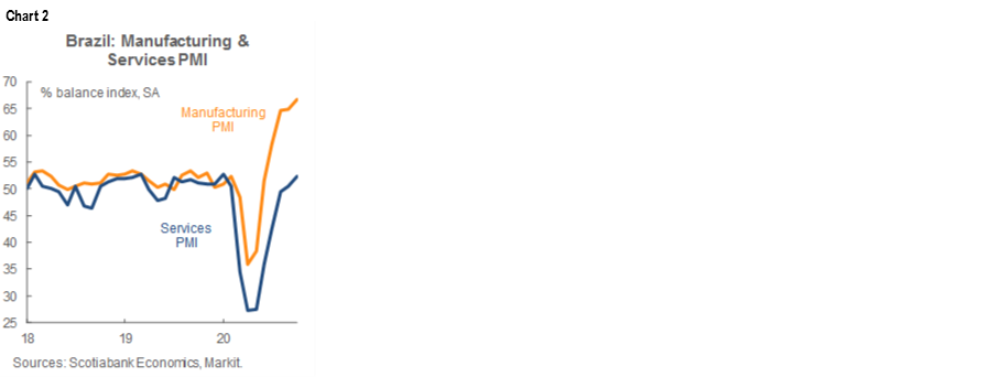 The Brazilian economy gained some further traction in September–October according to industrial production and PMI data. On the September industrial production front, data out Wednesday, November 4, showed an improvement from -2.5% y/y in August (revised up from -2.7% y/y) to 3.4% y/y, beating consensus calls for 2.5% y/y and our own expectation of 2.7% y/y. In the Markit manufacturing PMI for October, we had expected a dip from 64.9 in September to 63.9 in October, but the actual print strengthened to 66.7 in the release from Tuesday, November 3 (chart 2). We also saw the Markit services PMI, out Thursday, November 5, improve to 52.3, up from 50.4 in September and better than our expected 49.8 level.