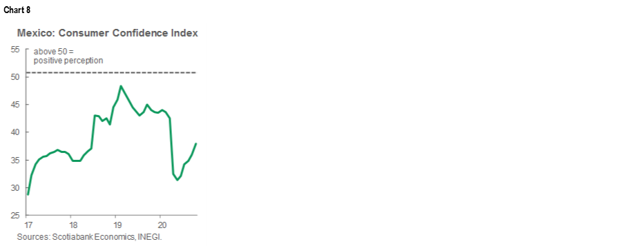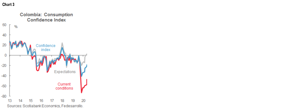 Looking at October’s details, the Current Conditions Index improved significantly to -47.3 ppts versus September’s -57.6 ppts, leading to the headline index's rise. On the other side, the Expectations Index remained just barely positive at 0.5 ppts (versus the previous 2.4 ppts in September). It appears that announced re-opening measures were absorbed positively by Colombian households; however, as uncertainty remains significant, households are still cautious about the future.