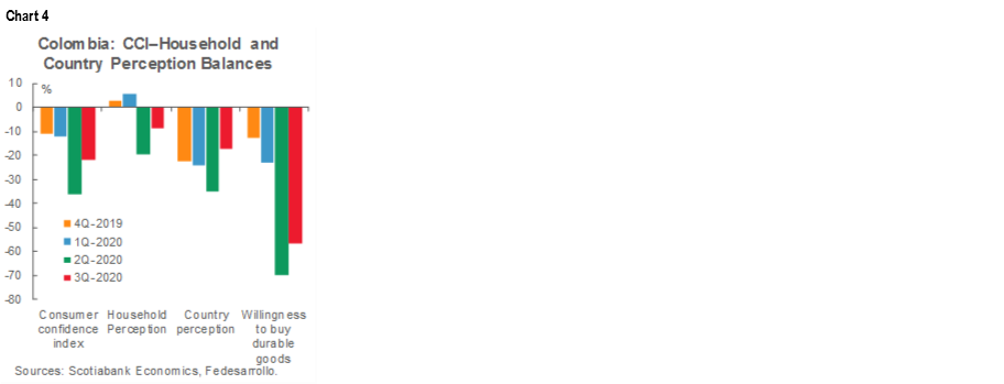 October’s Consumer Confidence Index (CCI), released on Thursday, November 5, stood at -18.6 ppts, rising 3 ppts from September’s level (-21.6 ppts). In October, the CCI improved at a somewhat slower pace than in August and September, and showed us a mixed picture on Colombians’ sentiments since the assessment of current conditions remained negative, but the index of expectations about the future stayed narrowly in positive territory (chart 3). Also, at the same time that the overall consumer confidence index remained fairly deeply in negative territory, business confidence is currently positive.