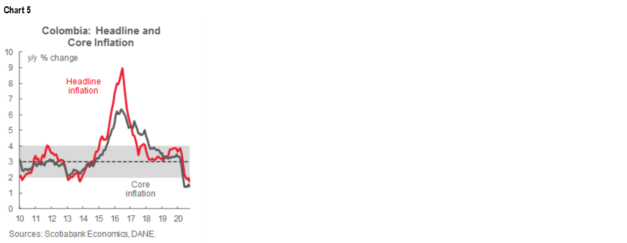 We still forecast next year’s annual inflation rate to converge to a level slightly below BanRep’s 3% target by end-2021. For now, headline inflation supports keeping the policy rate at 1.75% for the rest of 2020 and into 2021.