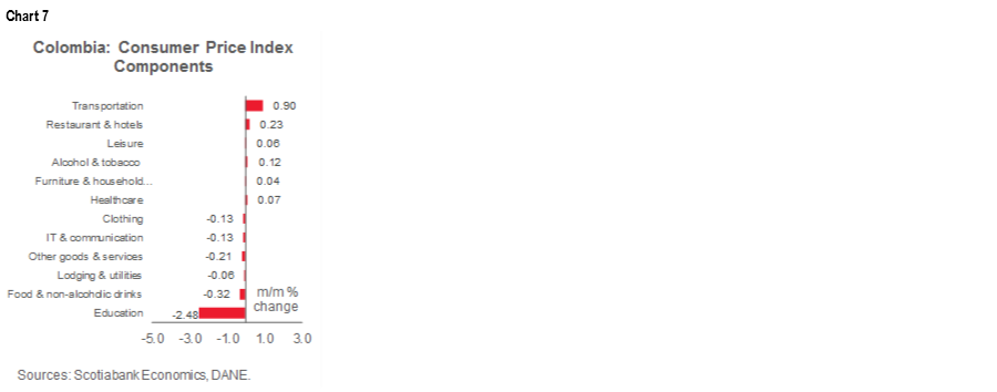 The transport-related sector provided the largest positive contribution (11 bps, charts 6 and 7) to headline inflation in October, due to increases in prices for inter-municipal transportation (19.9% m/m), urban transport (0.36% m/m), flight tickets (5.75% m/m) and vehicles (0.42%m/m). Transport inflation was driven mainly by biosecurity costs and probably also reflected some FX pass-through effects. On the other side, education prices came down -2.48% m/m, which provided a -11 bps influence on headline inflation. Tuition fees at universities and technical education institutes fell -8.96% m/m due to an atypical collection of prices since those institutions haven’t closed their registrations yet. However, DANE indicated that the negative effect of education prices on inflation is over.