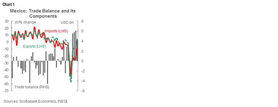 On Tuesday, October 27, INEGI released September’s trade data, which continued to show a significant surplus at USD 4.3 bn (chart 1). While this marked a substantial pullback from August’s high of USD 6.1 bn, it was a fourth consecutive month of surplus and a fourth straight month in which the trade balance exceeded consensus expectations, which anticipated USD 4.0 bn in September. The better-than-expected surplus was driven by the first annual increase in exports since March at 3.7% y/y, while imports were off by -8.5% y/y—which was still an improvement from August’s -22.2% y/y. As a result, total foreign trade flows (i.e., exports + imports) attenuated their decrease considerably from -14.9% y/y in August to -2.4% y/y in September.