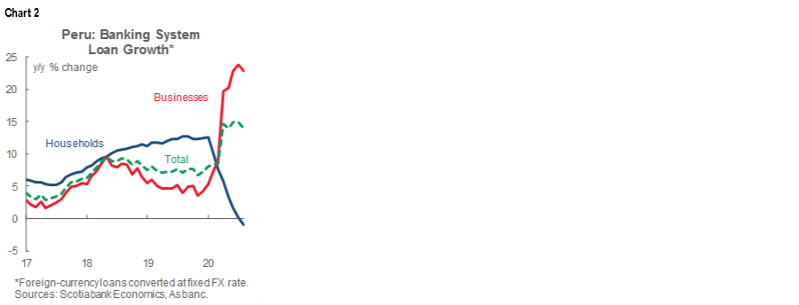 Bank loans were up a robust 13.6% y/y in September according to data recently released by Peru’s banking association, Asbanc (chart 2). This marked a slight slowdown from 14.0% y/y in August. The drop was expected and is projected to continue as the REACTIVA government-sponsored loan program slows. In the details, underlying trends continued. Business loans were up 22.9% y/y, led by small-business lending, which rose a huge 57% y/y. The REACTIVA loans, especially those under its more recent phase 2, were earmarked by the authorities for credit to SMEs. On the other end of the business-loans spectrum, corporate loans rose a negligible 0.2% y/y. This may be more representative of actual economic activity, whereas the REACTIVA-linked loans represent demand for emergency liquidity.