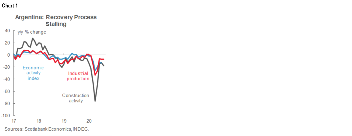 Annual growth slowed in both industrial production and construction activity in August, according to data released by INDEC on Wednesday, October 7 (chart 1). Industrial production growth pulled back from -6.6% y/y (revised from -6.9% y/y) in July to -7.1% y/y in August, while construction activity growth retreated from -12.9% y/y in July to -17.7% y/y in August. Together, the two sectors account for nearly a quarter of GDP and they provide an early pointer to what was likely a further slowing in the Argentine recovery in August. Growth in the monthly GDP proxy already cooled from -11.7% y/y in July to -13.23% y/y in August.