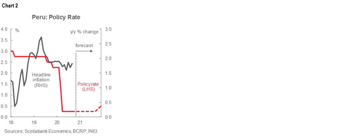 At its meeting in the evening of Wednesday, October 7, the BCRP, Peru’s Central Bank, kept its reference interest rate unchanged at 0.25% for a sixth consecutive month (chart 2), in line with our expectations and a unanimous consensus.