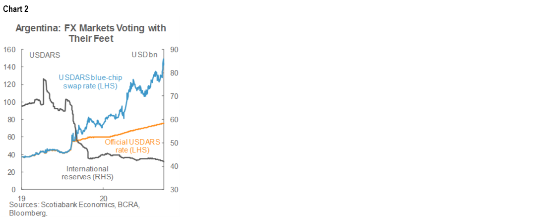 The halo generated by the recent restructuring of USD 65 bn in foreign-law bonds that were in default is fading quickly and Argentina’s balance of payments remains under pressure. FX reserves continue to edge down, with an estimated 90% of the existing USD 42 bn holdings (chart 2) thought to be committed to pre-existing obligations. Last week, the blue-chip swap rate surged at one point to a record USDARS 149.31 after the authorities tightened FX controls and USD deposits continued to drain out of the financial system. Near-term hopes are pinned on a rapid agreement to roll over Argentina’s outstanding debt to the IMF, which would extend the grace period on its obligations by over three years. But an understanding on a new lending program will almost certainly feature some combination of a gradual liberalization of FX controls, ARS devaluation, and higher interest rates.