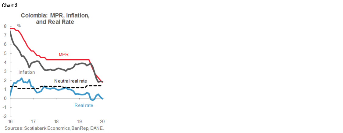On Friday, September 25, BanRep cut the monetary policy rate (MPR) by -25 bps to 1.75% (chart 3) in a divided decision: four members voted for the cut, while three voted for a hold. The communiqué emphasized that both inflation and inflation expectations are at low levels, while the economy remains weak. The Board observed that the labour market remains a concern and that household disposable incomes have fallen significantly, which probably was the main reason that the Board voted to continue the easing cycle.