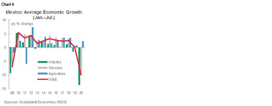 According to figures released by INEGI on Friday, September 25, growth in the Global Indicator of Economic Activity (IGAE in Spanish) slowed from 8.95% m/m in June to 5.69% m/m in July even after further progress in Mexico’s gradual re-opening. In annual terms, the decline in real GDP softened from -13.18% y/y in June to -9.84% in July, almost in line with market expectations of -10.10% y/y. This marked a seventh straight month in which the monthly GDP proxy has been down from a year earlier. Declines in industry and services dominated the comparisons with a year ago. For the first seven months of the year, the IGAE was down an average of -9.9% y/y, the worst decline for the January–July period in recent history (chart 4).