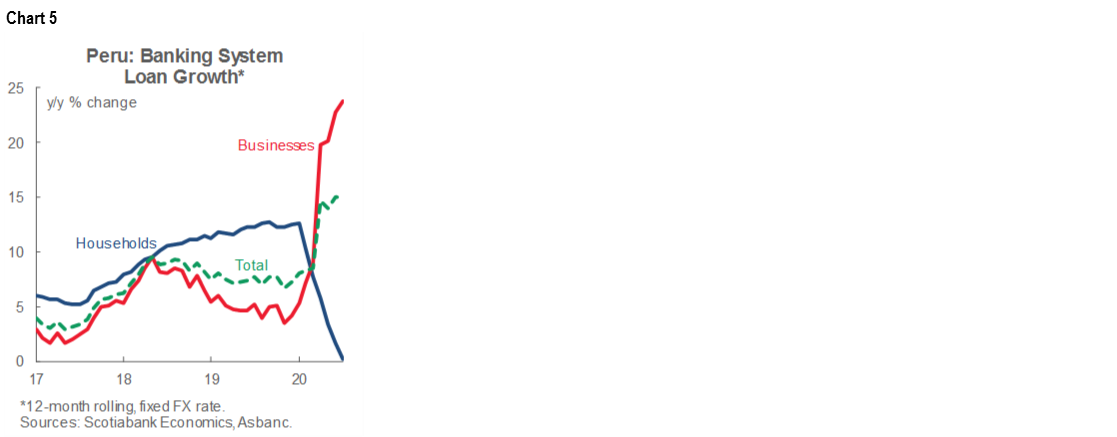 Total bank loans were up 15.0%, y/y in August, according to data released by Asbanc, on par with growth in July (chart 5). The strong performance largely reflected the BCRP’s liquidity programs, especially the PEN 60 bn REACTIVA program, which is channeled through banks to businesses. As a result, total business loans were up 23.7% y/y, led by small business loans, which rose an impressive 49.5% y/y. These programs have been key in maintaining payment chains during the lockdown and its aftermath. Meanwhile, household loans were basically flat, with 0.2% y/y growth (chart 5, again). Unlike business loans, household loans are more in line with the decline in demand and employment. The one hopeful sign on the household front is that mortgage loans outstanding rose m/m in August for the first time since March.