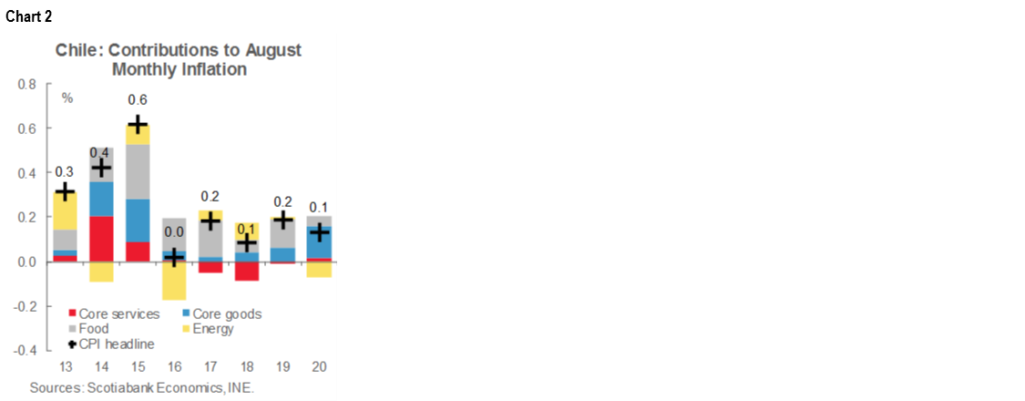 August inflation, out on Tuesday, September 8, reflected withdrawals from individual retirement accounts at the pension funds (chart 1). The national CPI increased 0.1% m/m in August (2.4% y/y), in line with our projections, with price increases in 9 of the 12 divisions. As expected, both food and alcoholic beverages prices rose again in the month and reached 6.3% y/y and 4.9% y/y growth, respectively, over the last 12 months. Clothing and footwear prices rose 2.3% m/m, ending recent price decline and marking one the fastest price increases for this division during the last eight years and one of the largest contributions to the month’s inflation reading. At least part of this was driven by demand for luxury goods as Chileans spent funds withdrawn from their AFP retirement accounts. The strong increase in retail sales led to stock shortages and is supporting our view that annual inflation would end 2020 at 2.2% y/y, somewhat below what the central bank projected in its last base scenario.