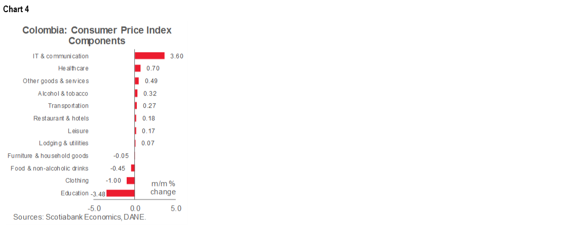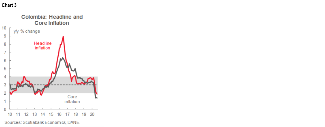 Monthly CPI inflation was -0.01% m/m in August, according to DANE’s data published on Saturday, September 5. The result came in below market expectations (0.09% m/m, according to the BanRep’s survey) and our projection of 0.37% m/m. August inflation resulted from offsetting effects between the upside impact on prices of the end of some government aid and a reduction in tuition fees in universities and technical education as a result of an extraordinary dropout rate. The annual inflation rate decreased by 9 bps from July to 1.88% y/y, the lowest since November 2013 (chart 3). Core inflation stood at 1.37% y/y (previous: 1.42% y/y). Although the core remained well below the central bank’s target range, it fell less than the headline figure.
