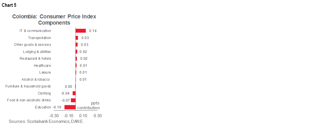 Foodstuffs inflation contributed negatively to the monthly figures (-7 bps), which partially offset price increases in other groups. Staple food prices, such as rice (-5.19% m/m), potatoes (-8.03% m/m), and eggs (-1.96% m/m), contributed the most to the negative inflation result in this group. We think food inflation could remain low for the rest of the year.