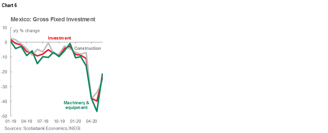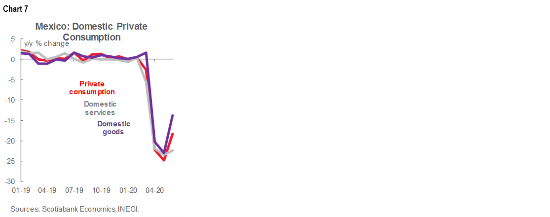 Gross fixed investment (GFI) for June, published on Monday, September 7, continued to register year-on-year declines, but the pace slowed from May (chart 6). On a monthly basis, however, investment showed solid growth, after most non-essential activities resumed. Nevertheless, a high level of uncertainty still prevails, which affects the business environment, reflected in very weak business confidence and the worst economic outlook for Mexico in recent history as a result of the health crisis caused by COVID-19.