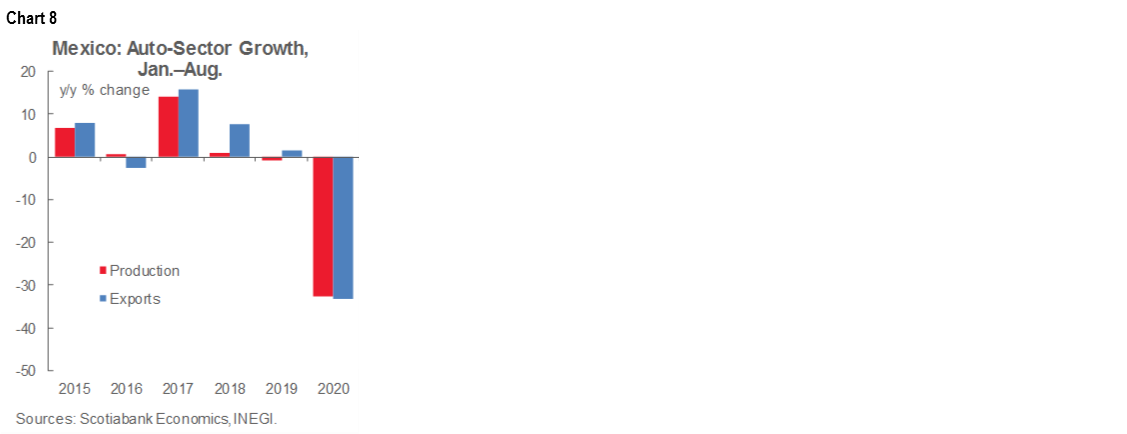 Auto sector advances slowed in August data released on Friday, September 4. Auto production was down -13.2% y/y during August; although the cumulative January-August modestly curbed its reduction from -35.5% y/y to -32.6% y/y (chart 8). Domestic vehicle sales moderately mitigated their year-on-year contraction to -28.7% y/y, against export growth, which deepened its deterioration to -8.6% y/y.