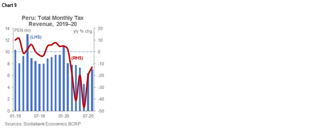 Tax revenue in August was down 13% y/y (chart 9), according to figures released over the weekend by Sunat, the tax agency. This was not good—but also not that bad. It was the best month (i.e., the softest decline) since February, and 10% better than July. However, 10% better than July, with an absolute number of PEN 7.1 bn, was not really good enough. On the other hand, the results would likely have been better, and more in line with a rebounding in economy, if not for tax relief measures that were still in force in August. The government provided a number of measures in March, at the beginning of the lockdown, that allowed companies and individuals to postpone tax payments. August is a difficult month to interpret, as some of the tax relief measures were lifted, but others will last until September. Thus, September will actually be the key to see how the tax revenue trend is performing. In the details, income tax revenue fell -14.5%, y/y, while sales tax (domestic) was down -11% y/y.