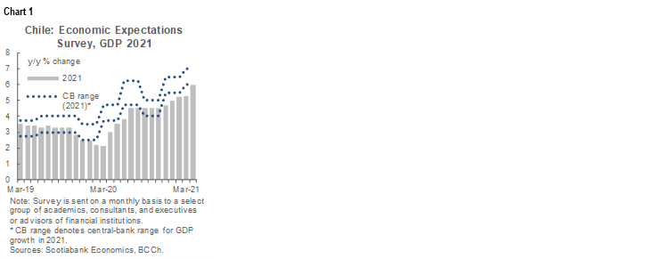 The BCCh published on Monday, April 12, its Economic Expectations Survey for April, which showed an improvement in the consensus forecast for 2021 real GDP growth from the March Survey’s 5.3% y/y to 6% y/y. This is in line with the adjustments made by the central bank in its March Monetary Policy Report where it raised its range of expected GDP growth from 5.5–6.5% y/y to 6–7% y/y, with an implicit projection of 6.8% for this year (chart 1).