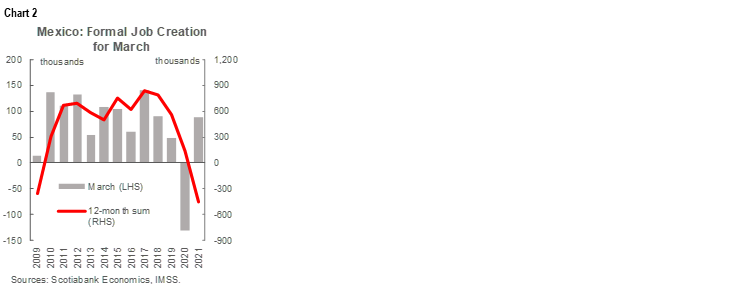 According to data released by the Mexican Social Security Institute (IMSS) on the afternoon of April 12, formal job creation moderated from 115.3k in February to 88.8k in March (chart 2). This was equivalent to 0.4% monthly growth. Formal jobs totaled 20.025 mn, of which 85.6% were permanent jobs and the remaining 14.4% were temporary positions. Thus, during Q1-2021, some 252k jobs were created, of which only 54.5% represented new permanent posts. Gains were focused in three out of nine sectors: processing (1.3% m/m), electricity (0.02% m/m), and social and community services (0.02% m/m). However, on an annual basis, the gap in total formal jobs compared with the pre-pandemic period improved from -3.3% y/y to -2.2% y/y, but was still in negative territory.