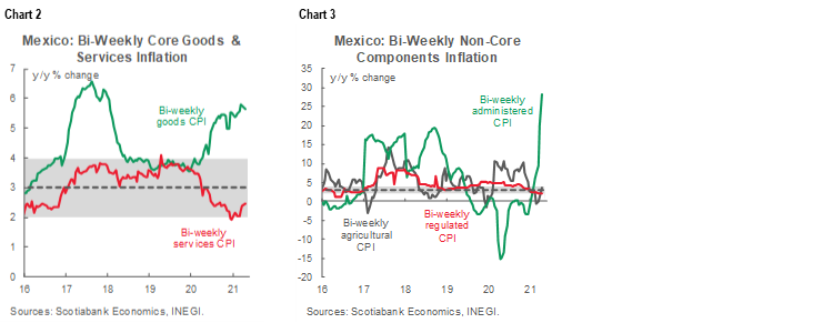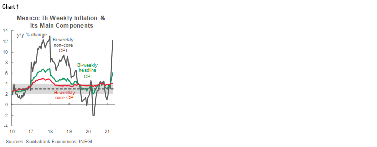 According to data released by INEGI on Thursday, April 22, headline inflation in the first half of April came in above market consensus at 6.05% y/y (versus 5.22% y/y in late-March and the 5.9% y/y consensus), well above the 4% y/y upper bound of Banxico’s target range (chart 1). Sequential inflation came in at 0.06% 2w/2w compared with the -0.13% 2w/2w average expected in the Citibanamex Survey. Since 2010, inflation for this fortnight has tended to be negative, but upward price pressures in its major subcomponents caused this fortnight to be an outlier.
