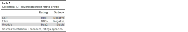 For additional context, recent communications from Fitch (which also pegs Colombia at BBB- with a negative outlook) indicated that it would wait until after the pandemic passes before updating its view on any countries with a negative outlook. At the outset of the COVID-19 crisis, S&P cut Colombia’s outlook from stable to negative, while Fitch downgraded Colombia to BBB- and kept its outlook at negative (table 1).