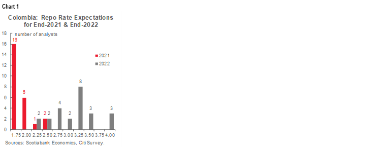 - Market consensus pointed to rate stability. All analysts surveyed thought the monetary policy rate would remain at 1.75% in the April 30 BanRep Board meeting; for the remainder of 2021, analysts’ projections are dispersed between stability and 75 bps of hikes, although 16 out of 25 economists surveyed expected rates to remain unchanged in 2021. In 2022, the average policy rate forecast is 3.00%, although half of the respondents looked forward to an even higher policy rate by the end of next year (chart 1).