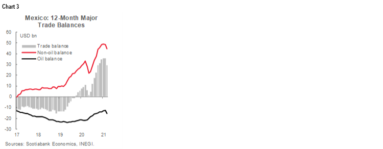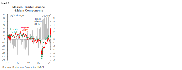 According to INEGI data released on April 27, Mexico’s March recorded a surprise trade deficit of USD -3.0 bn versus the USD 3.4 bn surplus in the Bloomberg consensus (chart 2). The move into deficit from February’s USD 2.7 bn trade surplus was driven by a surge in imports (31.4% y/y), which hit their highest year-on-year growth rate since August 2010 (36.5% y/y). March’s boost in imports was a good sign that domestic demand is starting to revive after lagging external demand for much of the pandemic. In contrast, exports rose at a more leisurely 12.2% y/y.