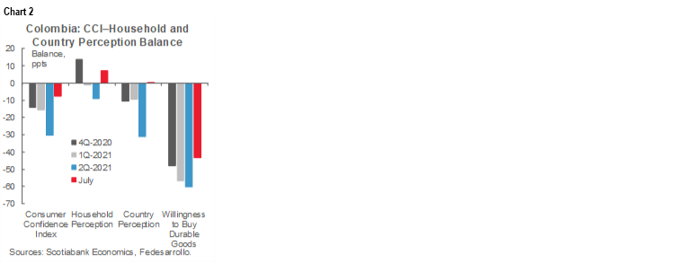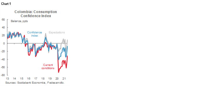 Data released by the Fedesarrollo statistical agency on Monday, August 9 show the Consumer Confidence Index (CCI) data for July at a balance of -7.5 ppts, improving from the -22.3 ppts in June. In July, continued progress was made towards the goal of reopening the economy, nationwide strikes ceased, and the vaccination rollout expanded to cover more age groups. Additionally, the third COVID-19 wave eased significantly. An improvement in the “current conditions sentiment” led the gains, while the expectations index is again in positive territory (chart 1).