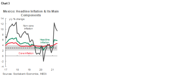 According to data released on August 9 by Mexico’s statistical agency (INEGI), consumer inflation in July of 0.59% m/m was slightly above the Citibanamex survey of economists consensus of 0.55% (chart 3). By components, core inflation rose 0.48% m/m, in line with expectations, while non-core inflation advanced 0.93% m/m in July. On an annual basis, the consumer price index stood at 5.81% y/y, slightly above the 5.77% y/y forecast by the latest surveys, but showing a modest deceleration from the 5.88% y/y registered in June.