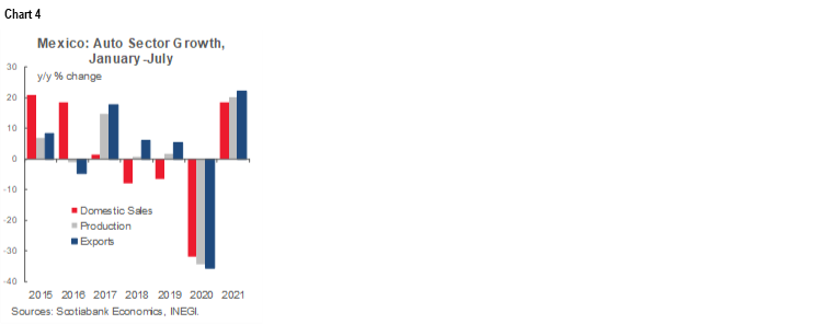 INEGI data released on August 6 show monthly declines in automotive industry production and foreign and domestic sales in the month of July. Light vehicle production continued to be disrupted by chip shortages and supply bottlenecks, declining -16.0% m/m following a 9.3% m/m increase in June. This is equivalent to 221,843 assembled units. On an annual basis, the number of vehicles assembled shrank by -26.5% y/y in July from the previous rise of 5.5% y/y. Likewise, the decline in exports deepened, falling -13.8% m/m in July (from -3.2% m/m in June) owing to lower production levels and inventory shortages. On an annual basis, exports dropped -23.6% y/y, with 202,021 exported units. Domestic sales fell -7.4% m/m on a monthly basis to 82,157 units, in line with the weakness in consumer confidence during the same month, as well as with the spread of the delta variant. In comparison, sales increased by 12.7% y/y over July 2020, but were -22.6% y/y below the same month of 2019.