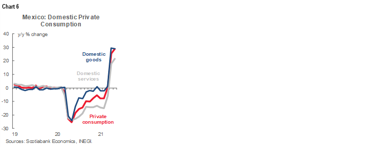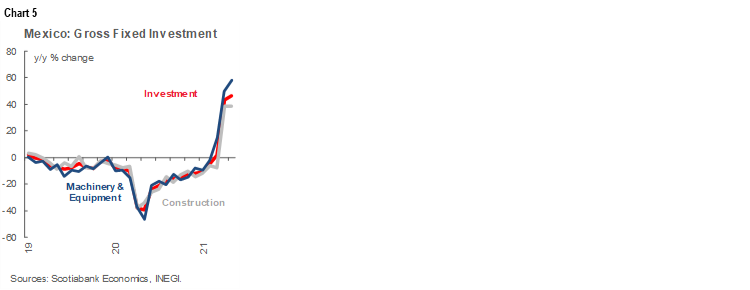 Base effects continue to weigh on year-over-year investment growth rates, which showed a 46.5% y/y growth in May, up from 43.0% y/y in April. Thus, in the first five months of 2021, INEGI reported a year-to-date surge of 10.0% in real investment compared to the same period a year earlier, the highest pace for an equivalent period since 2008.