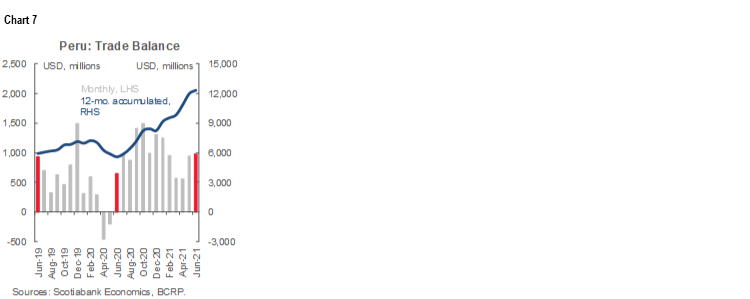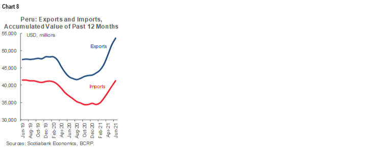 Peru’s trade balance has soared this year, reaching USD 12.3 bn for the 12 months ending in June 2021 (chart 7). This was the third consecutive record month in history. In comparison, the trade balance had been trending at half that level, about USD 6 bn, throughout 2019 and much of 2020. With the trade surplus at USD 5.2 bn in the first six months of 2021, the current trend is mildly below our forecast of a USD 15 bn trade surplus for the full year 2021, mainly because of the sharp rise in the prices of soft commodities and energy products that the country imports.