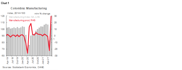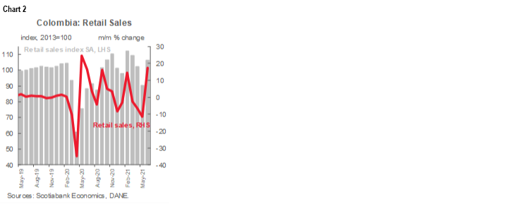 June manufacturing production and retail sales data published by Colombia’s statistical agency (DANE) on August 12 show that Q2-2021 closed with robust economic activity, registering a surprising rebound from the economic disruptions of the nationwide strikes in May. As a result, risks to our Q2-2021 GDP growth forecast (16.9% y/y) are skewed to the upside. Regardless, we reaffirm our view that the central bank (BanRep) will begin moving its hiking cycle by September 2021 with gradual adjustments of 25 bps.