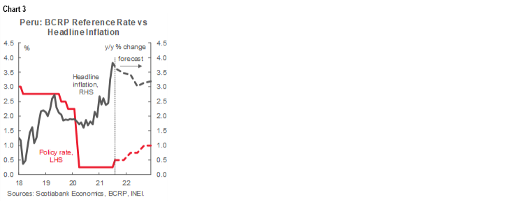 At its monthly meeting on Thursday, August 12, the Board of Peru’s central bank (BCRP) raised its key interest rate by 25 bps to 0.50% from its historical low of 0.25% (chart 3). While the decision was not widely expected by the market consensus, it is not surprising since the BCRP had already changed its narrative, opening the door to this possibility. There were also signals that raised the probability of a rate hike in that direction. The BCRP’s reference rate had been at 0.25% since April 9, 2020, following the onset of the pandemic.