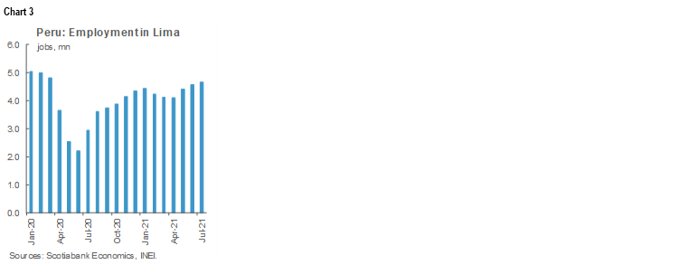The INEI also published information on employment in Lima for the three-month period ending in July. Jobs rose mildly, from 4.6 million to 4.7 million since June (chart 3). Employment in Lima is now 7.4% below pre-COVID-19 levels from January 2020. As a result, the unemployment rate has fallen to 9.4%, much better than our expectation of 10.3%. Unemployment still has a way to go before it returns to pre-COVID-19 levels that were closer to 7%. The job market results are reassuring. July was a month of significant uncertainty over the election results and profile of the new government, and yet there is no sign, so far, that this impacted the job market during the month.