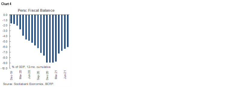 Fiscal accounts continued to improve in July. According to figures by the central bank (BCRP), the fiscal deficit fell to 6.0% of GDP, the sixth consecutive monthly improvement, after peaking at 8.9% of GDP in January-February (chart 4). July was especially positive for the economy, as the lower deficit is more the result of a strongly increasing tax revenue, rather than of slower spending. Tax revenue rose 41% y/y in the January–July period, whereas fiscal spending was up a still hefty, but lower, 23%. Since the 2020 comparison base is again distorted by last year’s lockdown, it is particularly interesting that both fiscal revenue and spending were also sharply up versus 2019, pre-COVID-19. Higher metal prices were, no doubt, behind the 35.7% y/y increase in income tax (17.5% versus 2019), but the 38.3% increase in domestic sales tax (8.8% versus 2019) is due to domestic factors, both the recovery in domestic demand, and the greater formalization of sales brought about by increased digitalization.