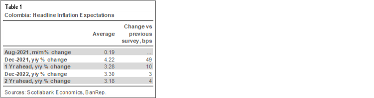 - Near-term inflation. August’s monthly inflation is expected to come in at 0.19% m/m, putting annual inflation to July at 4.17% y/y (from the 3.97% in July). However, survey dispersion remained high with a minimum expectation of -0.16% m/m and a maximum of +0.38% m/m, signaling still high uncertainty amid recent developments and their impact on prices. On the other side, Scotiabank Economics expects August’s monthly inflation at +0.21% m/m and 4.19% y/y, given that food inflation is not falling as expected due to long-lasting effects in the supply chains of critical products due to the recent protests and bottle necks in import goods logistics; additionally, utility fees are expected to rise.
