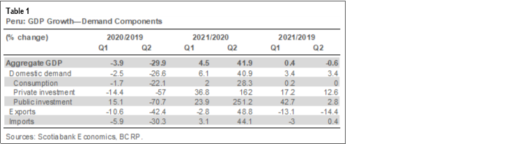 Peru’s central bank (BCRP) released the official GDP and domestic demand growth figures for Q2-2021 on August 20. As for GDP growth, the strength of private investment was the greatest surprise, especially considering signs of domestic outflow of short-term capital (more below).
