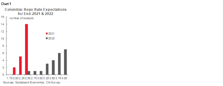 - The market consensus points to a 25 bps increase at the September BanRep meeting. By 2021, all 25 respondents expect rate changes (while the previous survey it was 3 out of 25). In 2022, the median policy rate expected is 4.0% (chart 1).