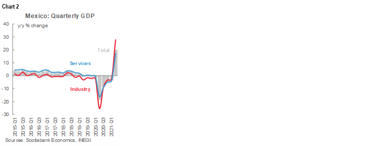 According to the statistical agency’s (INEGI) final estimate for Q2-2021 GDP published on Wednesday August 25, the Mexican economy registered a +19.6% real y/y expansion in Q2, slightly below the +19.7% y/y (chart 2) of the early estimate and recovering from the -3.6% y/y loss of the previous quarter. This brings the Mexican economy’s average performance over the first half of the year to 8.0% y/y. As is the case in other economic indicators, comparative base effects from 2020 explain most of Q2’s advance, however, the quarterly reading was positive, growing +1.5% y/y, as was estimated a month ago.