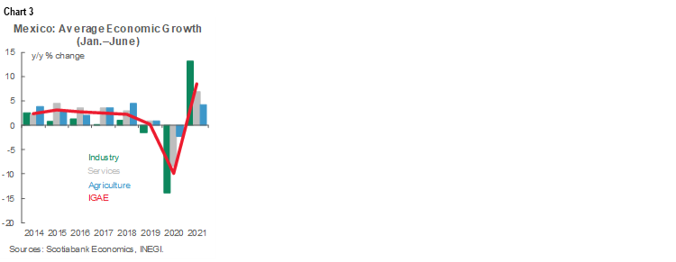 MEXICO: 8% Y/Y AVERAGE GDP GROWTH IN H1-2021; UPDATED 2021 GDP FORECAST; JUNE’S GDP PROXY SHOWS BASE EFFECTS DISSIPATE