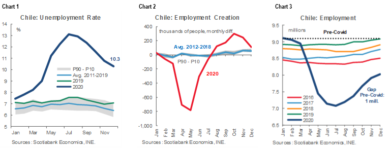 Chile’s national unemployment rate decreased again from 10.8% in the moving quarter September–November to 10.3% in October–December 2020 (chart 1). The reduction reflected greater dynamism in employment growth compared with labour-force participation despite December’s retreat toward tighter mobility restrictions. This should reverse in the coming months as job search increases, which should keep the unemployment rate at high levels for much of 2021. Despite the fact that employment continues to recover (chart 2), its pace slowed in the last months of 2020 and about 1 mn jobs lost due to the pandemic still need to be recovered (chart 3). According to INE estimates, the potential unemployment rate (i.e., which includes potentially active workers) is currently at 21.6%.