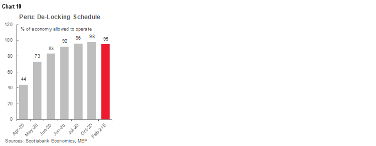 Previously, the Head of the Cabinet, Violeta Bermúdez, had stated that the activities that would be allowed to operate would correspond to phase 2 of the 2020 de-locking of the economy, which accounted for 83% of the economy (chart 10). However, the current list goes beyond last year’s phase 2 and incorporates much of phase 3, under which 92% of the economy was allowed to operate. Given that the current restrictions apply only to the 10 regions under Extreme Alert, which account for 64% of the economy, while the remaining 36% of the economy in other areas will continue operating with 98% of activity open, we estimate that 95% of Peru’s total economic activities will be allowed to operate during the current new quarantine measures, versus 98% prior to the measures (chart 10, again).
